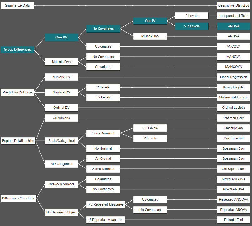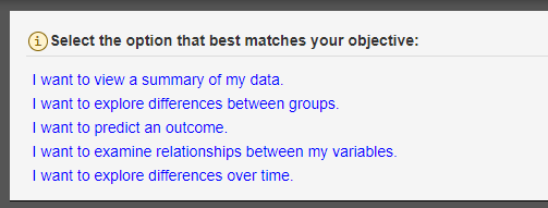 The decision tree is designed to help you choose which analysis is best for how you want to analyze your data. To use the decision tree, all you have to do is choose the best option that best answers the question or statement. Continue to answer the questions until an analysis is selected that meets the criteria you provided. As you answer questions, you will see the decision tree being highlighted, so you can see the decisions being made and see its path.
