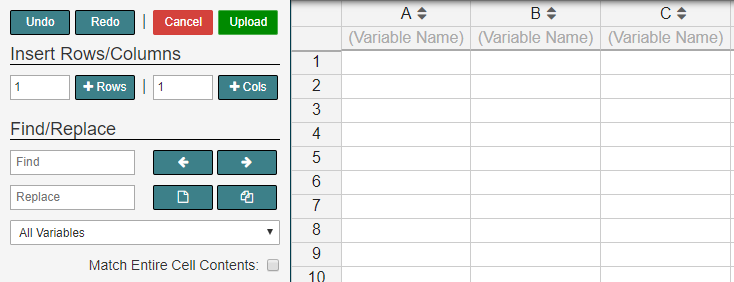 If you don’t have a file, you can upload data by entering the data from scratch in our data editor. The top row of the data editor should contain the variable names and the rows labelled 1,2,3, … should contain the data for the variables. After you are finished entering your data in the spreadsheet, click the Upload button. In order to find out more information about the Data Editor’s sidebar go to the edit data help page.