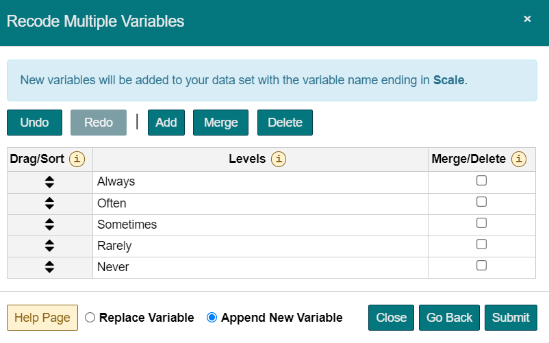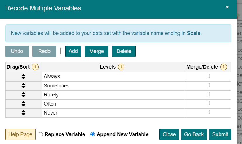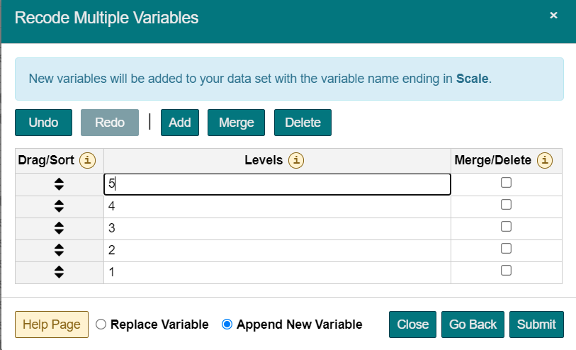 Intellectus Statistics has been designed to allow you to perform data management tasks while utilizing the software. After you first upload your data, you can verify the Level of Measurement for each of your variables, and can change the level by selecting the desired option from the appropriate drop down menu and following the subsequent instructions. The Manage Your Data page also allows you to perform further management tasks, including Reverse Coding, Computation of Composite Scores, Removal of Univariate Outliers, Removal of Multivariate Outliers, Transformation, and Multiple Imputation. To learn more about each of these options, simply scroll over the desired task and a pop-up window will provide more information. After you have performed your data management tasks, you have the option to download an updated data set that will reflect any changes you made.