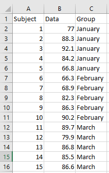If you have independent samples, where each observation is a different subject, you will need to create a grouping variable instead. Let’s go with the same example above, so we have some measurement by month, where each tab is a different month on independent samples. Putting the data onto one tab will look like this: