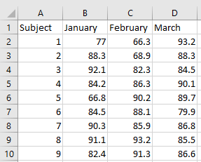 Matched-case data is when you have data for the same subjects in each group. Each observation will have a “Subject ID” that you could use to match rows across multiple samples. Combining matched-case data involves pasting the columns side-by-side and matching them by ID. Let’s say we have matched-case data for each month on a new tab. We can copy the columns of each tab and match up the “Subject IDs” and paste them in the data on the first tab. The end result will look something like this: