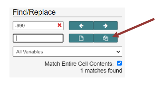Intellectus uses blanks for all missing data. If your data set has -999, -1, NA, or other values or symbols to indicate missing data, go to the Management tab, Click Edit data, then Find/Replace. Enter missing data symbol or number in Find/Replace, add a blank space in the Replace, and click “Match entire cell contents,” then click the “Replace All” icon indicated by the red arrow below.