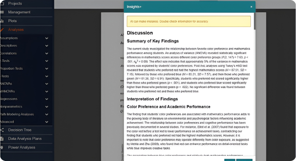 With a few clicks, download a natural-language interpreted output in a fully editable, APA 7th edition formatted Word document, complete with APA tables, figures, and references. This output ensures that each test is accurately interpreted.