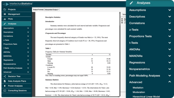 Powered by R, Intellectus Statistics offers a range of tests from simple to complex, featuring user-friendly interfaces, automatic assumption generation, APA 7th edition tables and figures, and plain English interpretations. Each analysis includes how-to videos and a glossary. Data visualizations are diverse, intuitive, and print-ready, with tailored features like scatterplots for correlations and interpreted control charts for seven rulesets.